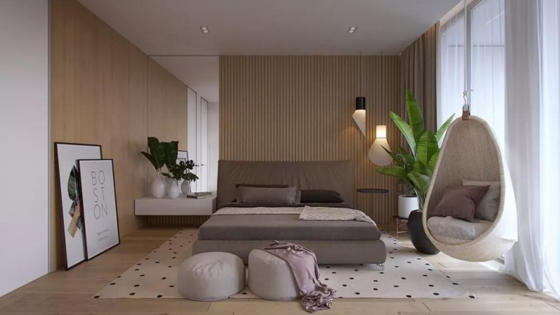 主卧室空间阔绰,整体上仍旧是大面积的木纹装饰,比如床头板和地板,包括部分家具、柜体。