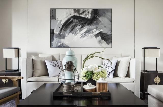 随后,从入口处一面墙的写意水墨淡淡的从远处慢慢渗入,于是,会客厅沙发背景、走道尽头端景、主卧床头背景以及案几上无意摆放的,都是或多或少、或重或轻的写意水墨,行云流水,一气呵成。
