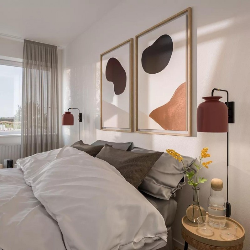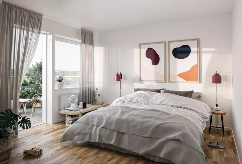 主卧室延续了简约轻松的设计风格,木纹和白色的配合天衣无缝。