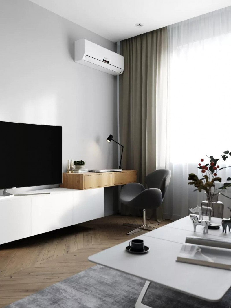 客厅有两扇大窗,由于业主有家里办公的需求,所以设计师利用电视柜的延伸,在窗口位置设置了写字台,这里成为家庭办公区。
