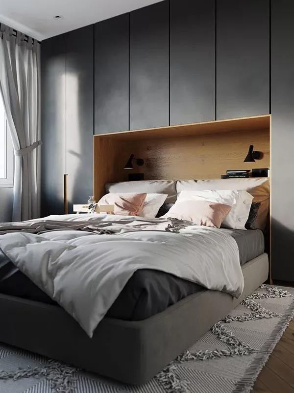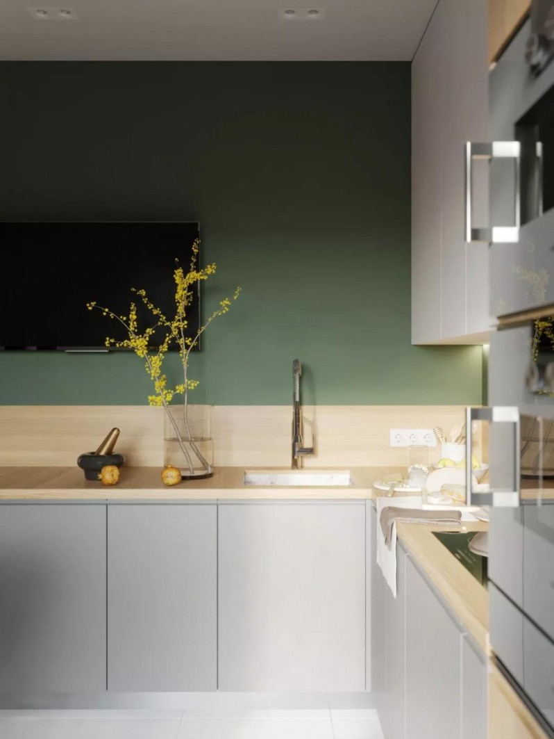 厨房的色彩组合颇有特色,灰色的吊柜,木纹台面和防溅挡板,还有绿色的墙壁。