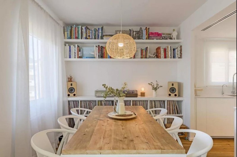 与客厅相邻的是厨房和餐厅区域,本来餐厅和厨房是有墙壁隔开的,但设计师还是任性的将墙移除,但留下了承重的柱子。
