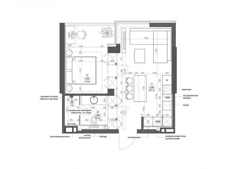 这是一个44平方米的一居室项目,户型方正,功能区布局科学,简约但偏成熟稳重的室内装饰非常耐看。