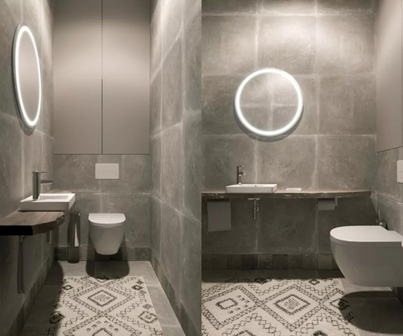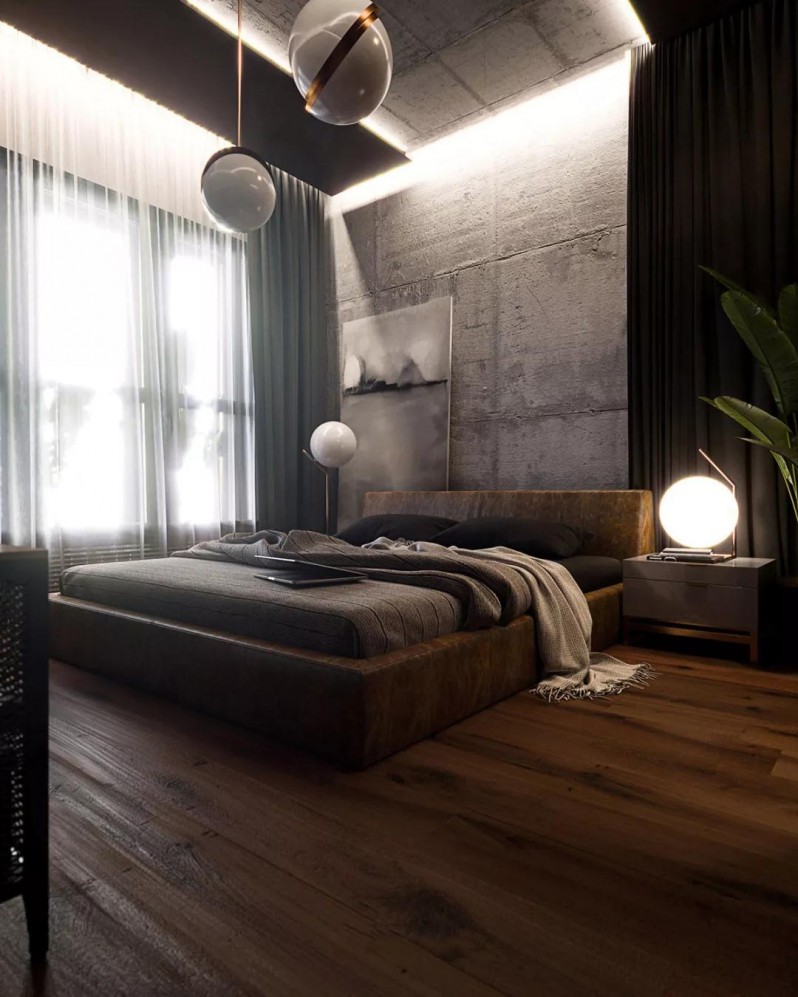 卧室保留了大佬混凝土墙面,家具和装饰也偏向于成熟稳重,毕竟这是休息之地,更注重隐私性和平和的氛围。