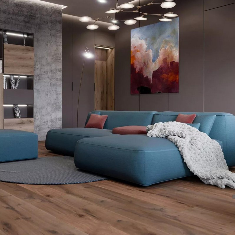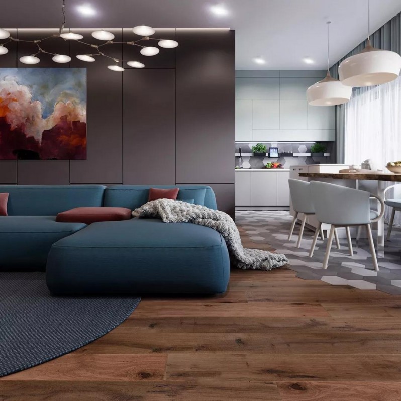 客厅使用了蓝色的大沙发,上面悬挂现代枝形吊灯,两者配合,营造出前卫和优雅的会客空间。