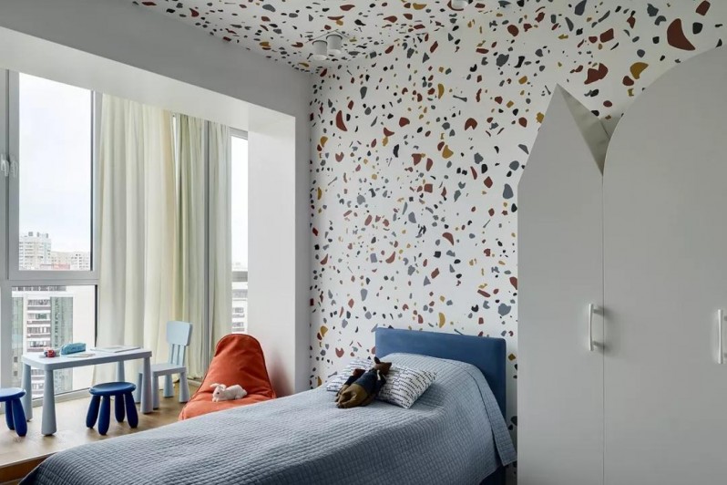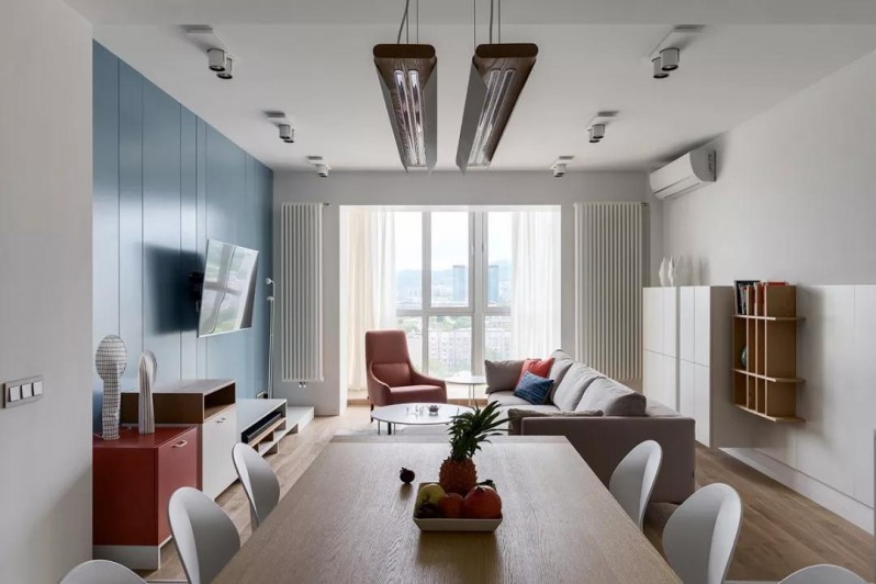 这是一套98平方米的二居室项目,为一对年轻夫妇和他们的小孩子而设计。房子的户型不是很方正,但设计师利用了独特的户型,尽可能保持室内明亮、通风,还借助色彩元素营造了欢快的室内氛围。