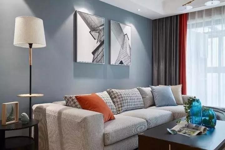 客厅背景墙是宜家风最受捧的灰蓝色调,搭配绘有年轮图案的米色布艺沙发,轻松愉悦又非常的温馨,给人家的感觉,素雅简单的抱枕不仅抱着非常舒服,还能填充过于素净单调的沙发,茶几选择了与餐桌一致的深咖色,在绿植和蓝色玻璃瓶的衬托下,很生动有意境感,也让整个客厅雅致清透不少。