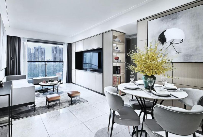 客餐厅在一个开放的空间内,整个风格格调保持一致。装饰画也是个系列的。
