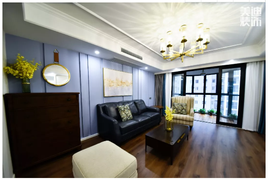 浅蓝色背景墙与墨蓝色皮沙发呼应却又有区别,层次美才是最高级的美。