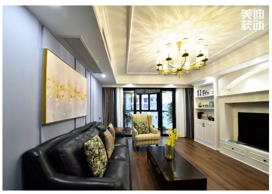 客厅设计具有美式风格的大气典雅,同时带有些许北欧时尚简约感,空间偏理性低调,线条简洁利落,丝毫不拖沓,快节奏中又带着一丝慢调。