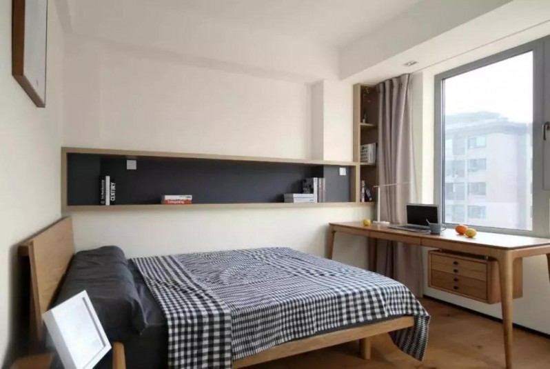 次卧延续简约的布置,在墙面做了壁龛的设计,可以摆放一些物品,还在床尾摆放了一张书桌,方便学习工作,实用和颜值兼具。