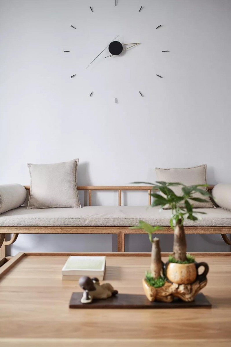 沙发背景墙为了不显得单调,还做了一个表来装饰,简约还不显单调。搭配上同样简约的沙发和茶几,显得自然又纯粹,带有大自然的气息,让人想要亲近。