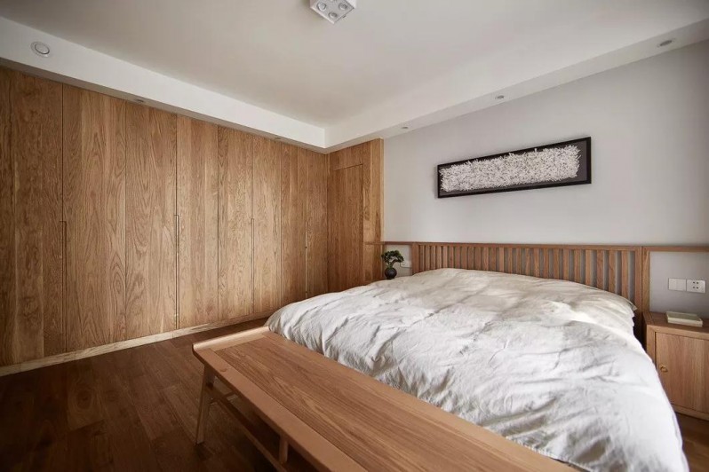 主卧的空间还是挺宽敞的,地面是木地板,墙面也是木板的,大衣柜嵌入墙面,衣柜没做把手,和墙面融为一体,还有原木的床头柜,,一点多余的家具、装饰都没有,显得卧室很温馨宽敞。
