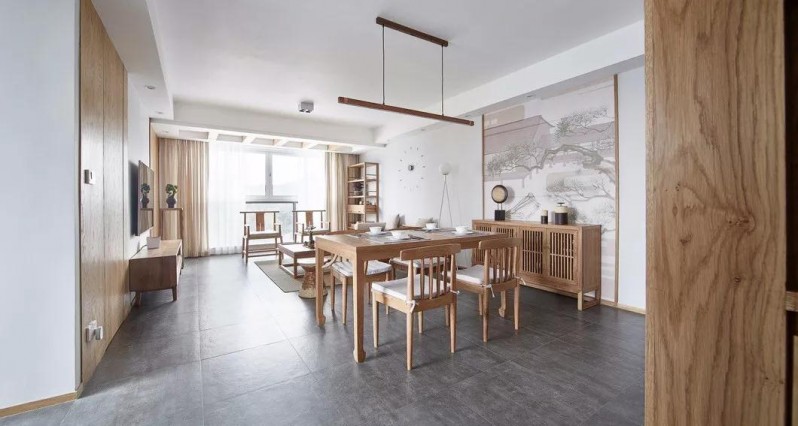 餐厅是开放式的布局,就在客厅的一旁,还是原木的餐桌椅,造型简单大方,旁边还有同样是原木的餐边柜,餐边柜紧靠墙面,墙面挂了一副简约的挂画,很有日式风格。