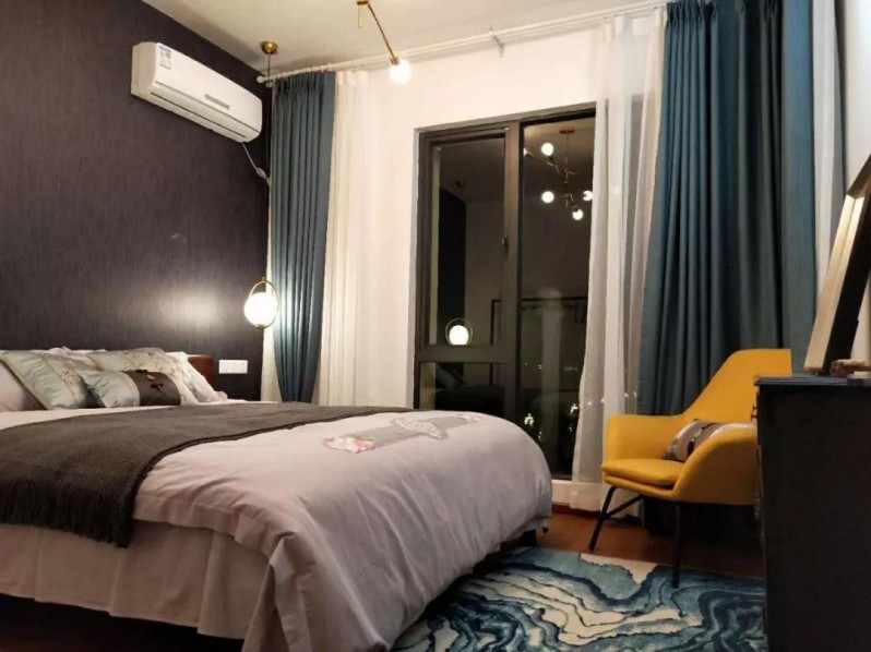 客厅设计极为简约,小茶几+多人沙发,软装搭配亮点在于客厅的地毯,短绒毛地毯质感舒适,金线修边纹路装饰,给人一种轻奢美。