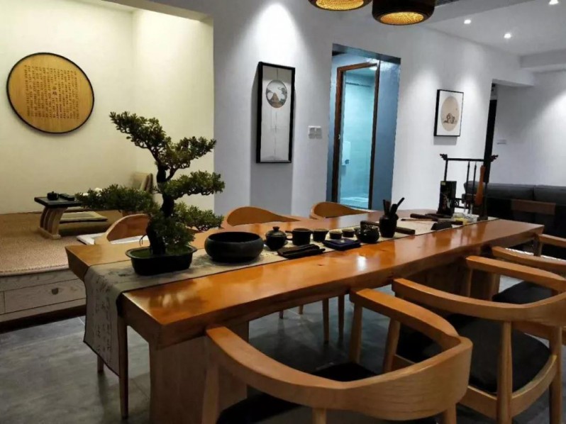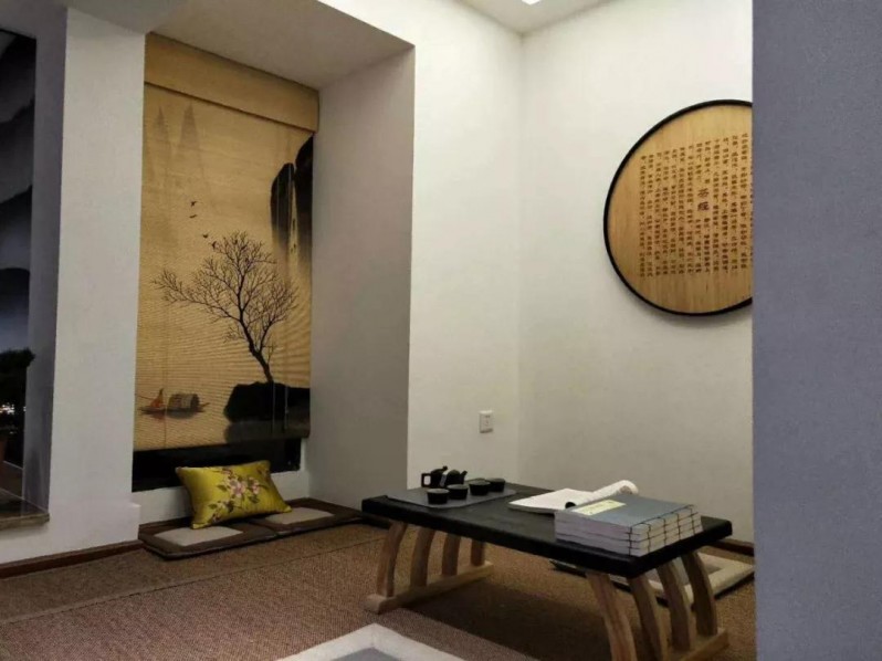 餐厅对面是榻榻米设计,可会客,可书写,古风韵味的竹席卷帘,书法挂画作品,处处都能感受主人的品位。