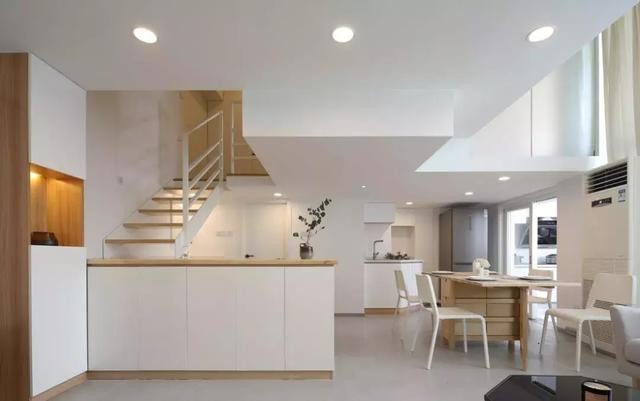 楼梯间的设计也十分出色,一半做成开放储物箱,半高台面还可以作为吧台,高的楼梯下边放置卫生间洗手台,镂空设计不会太压抑。