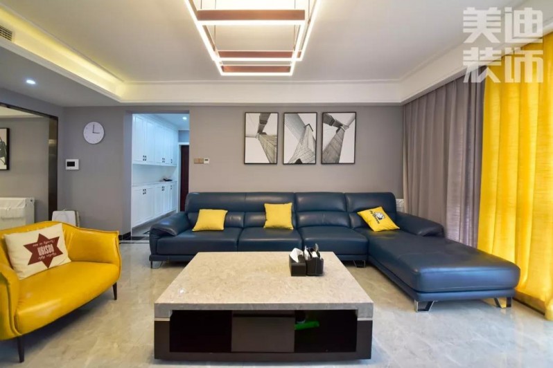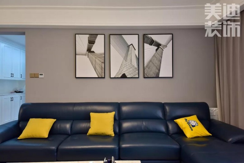 整个空间调性以灰色为主,凸显空间质感,沉静的深蓝色皮质沙发与活泼黄色调的枕头点缀使空间亮了起来。