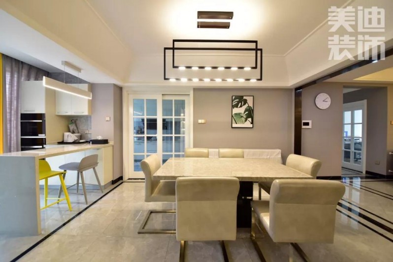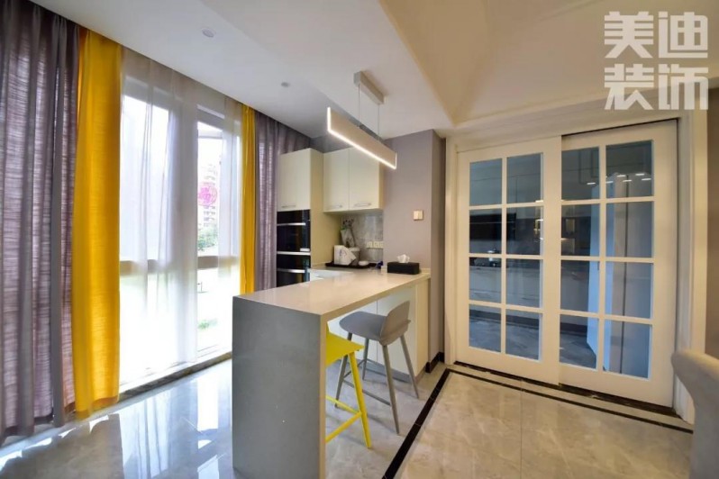 房主杨姐特别喜欢研究菜品,经常在家做西点,追求精致的生活。设计师在设计中尽可能减少隔墙,弱化视觉阻碍的同时放大空间的通透性,从而使整体空间氛围更加简洁典雅。在色彩方面,采用对比色相搭配法,体现出空间的视觉焦点,彰显活力。