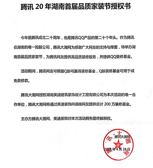 经过腾讯湖南的严格筛选和大量样本的用户调查,美迪装饰从数十家湖南家装企业中脱颖而出,成为本次活动唯一指定合作单位。腾讯大湘网将通过美迪装饰向湖南网友提供总计200万装修基金。