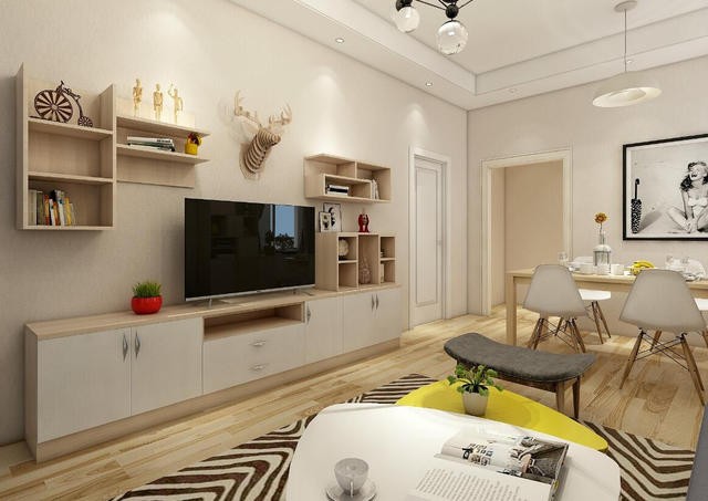原木色的北欧风格也是性冷淡风格的一种。在装修设计上,可以根据自己房间户型的大小、个人喜好以及生活习惯来进行家具的定制。如果客厅空间够宽敞,可以将电视墙设计成几何摆件的样式;如果空间不是很大,则可以将电视墙设计成储物柜的形式,以此来增加储物的空间。