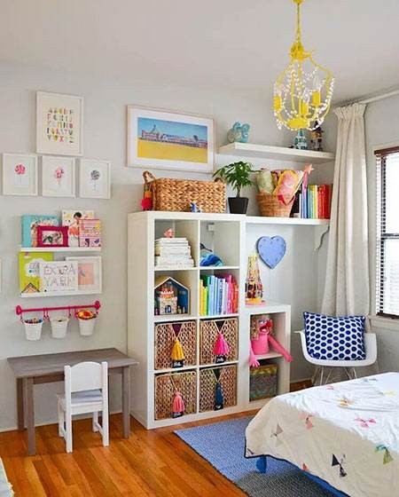 比起一些呆板的收纳方法,搁板收纳会让儿童房显得活泼很多,安装在墙面上,不仅可以收纳孩子们的玩具和书籍,而且还能节省更多有效的空间供孩子们玩耍。