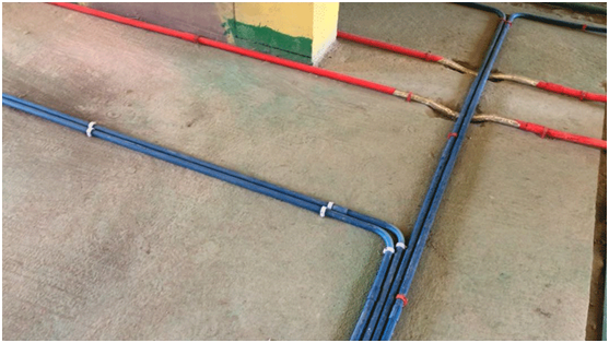 进入室内,因是水电工程阶段,最显眼的就是各种横平竖直的管道了。根据管道红、蓝
