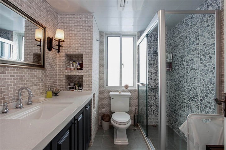 墙面是占据整个空间大部分面积,而整体色彩会给人先入为主的既视感,因此,提升的关键要从墙面开始,在颜色上,宜选用清冷淡雅色调,除给人以干净清爽之感外,也会增加空间感,如不规则条纹大理石,让整个卫生间充满随性,轻松