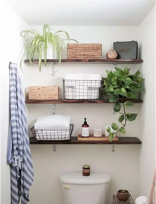 如果你觉得上面都比较麻烦,那么可以选择摆一个小梯子在马桶上方,靠墙安放,不会占用过多的空间,收纳毛巾等很是方便。