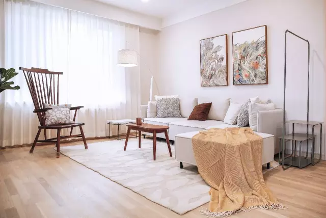 客厅通过白色与木色来提亮空间,搭配简约而别致的功能性家具,整体看上去淡雅、柔和,带来一种宁静的感觉。